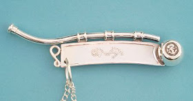 The pipe or whistle, either term is correct, is akin to a piccolo and is carried by a ship’s bosun (boatswain) as a symbol of authority. Generally the pipe dangles from a chain worn around the neck, but it can be carried in various different ways as well. The pipe is descendant from the now archaic Admiral’s whistle. This was a small instrument made of gold and worn around that officer’s neck as a symbol of rank. By the 18th century, bosun’s pipes were made of silver, nickel or brass and so they are to this day.